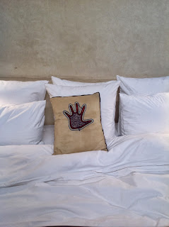So today marks the first day of my vacation, I mean my fact-finding trip to Morocco. I’m hoping to learn more about traditional beliefs about the Jinn and incorporate them into my novel. I didn’t need to look far to find some beautiful renditions of the Hand of Fatima to ward off the evil eye. Above is a lovely embroidered hand on the riad’s pillow. Tomorrow we’re heading into the twisting alleyways of the souk to look for more examples of the famous hamsa symbol, and perhaps pick up a magic potion or two. Meanwhile, the weather and the sights in the salmon-pink city of Marrakech are gorgeous: